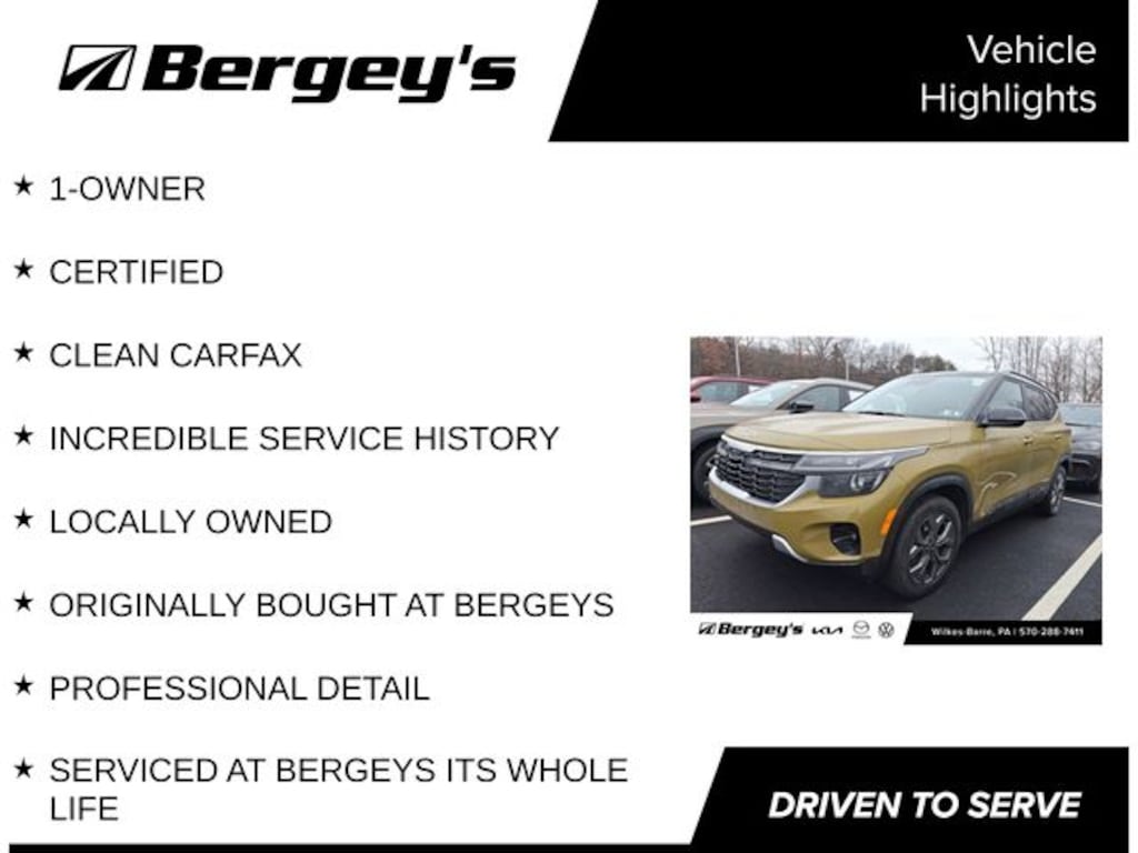 Certified. Valais Green/Black Roof 2024 Kia Seltos S AWD CVT 2.0L I4 MPI 1-OWNER, CERTIFIED, CLEAN CARFAX, INCREDIBLE SERVICE HISTORY, LOCALLY OWNED, ORIGINALLY BOUGHT AT BERGEYS, PROFESSIONAL DETAIL, SERVICED AT BERGEYS ITS WHOLE LIFE.