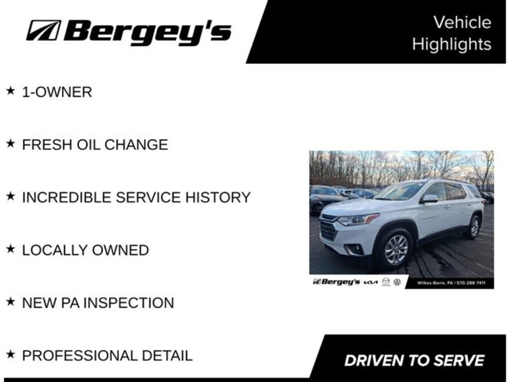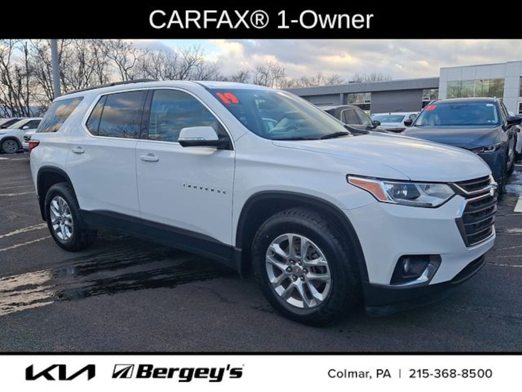 Summit White 2019 Chevrolet Traverse LT Cloth w/1LT AWD 9-Speed Automatic 3.6L V6 SIDI VVT 1-OWNER, FRESH OIL CHANGE, INCREDIBLE SERVICE HISTORY, LOCALLY OWNED, NEW PA INSPECTION, PROFESSIONAL DETAIL, AWD.