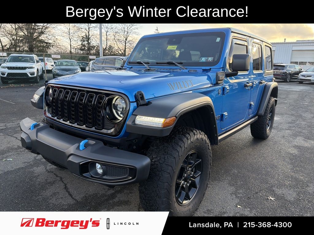 2024 JEEP WRANGLER WILLYS 4-DOOR HARDTOP 2.0L 4WD w/ CONVENIANCE PKG! ONE OWNER! CLEAN CARFAX! ORIGINAL MSRP: $60,615! 17 BLACK WHEELS, HEATED SEATS, REMOTE START! BALANCE OF FACTORY WARRANTY! PA State Inspection & First Oil Change At Bergeys! Hydro Blue Exterior, Black Cloth Interior. Vehicle Features: 2.0L I4 DOCH DI Turbo PHEV Engine, 8-Speed Automatic Transmission, 4 Wheel Drive, 4.10 Rear Axle Ratio, Conventional Differential Front Axle, Tru-Lok Rear Axle, Willy's Suspension, 17 X 7.5 Painted Black Wheels, Off-Road Plus Mode, Rock Protection Sill Rails, Front LED Fog Lamps, LED Premium Reflector Headlamps, Receiver Hitch, 7-Pin And 4-Pin Wiring Harness, Heated Front Seats, Heated Steering Wheel, Front Door Passive Entry And Lock, Remote-Start System, Emergency/Assistant Call, Black 3 Piece Hard Top, Rear Window Wiper/Washer/Defroster, Freedom Panel Storge Bag, Daytime Running Lamp LED Accents, Front Fog Lamps, Automatic Headlamps, Integrated Window Antenna, Body-Color/ Accent Color Grille, Full-Body Color Fender Flares, Blue Tow-Hooks, Power Locking Fuel-Filler Door, Power Heated Mirrors, Variable Intermittent Windshield Wipers, Uconnect5 w/ 12.3 Touch Screen Display, Apple CarPlay, Google Android Auto, Satellite Radio Ready, Jeep Connect 4G LTE Wi-Fi Hot Spot, Hands Free Phone And Audio, 8 Speakers, 7 Driver Information Digital Cluster Display, Power Front Windows w/ One-Touch Down, Air Conditioning W/ Automatic Temperature Control, 6 Way Manual Adjustable Driver Seat, 3rd Gen Heavy- Duty Dana 44 Front And Rear Axle, Conventional Differential Front Axle w/ Disconnect, 3.73 Rear Axle Ratio, Electronic Stability Control, Advanced Break Assist, Adaptive Cruise Control w/ Stop, Rear Back-Up Camera, Full Speed Forward Collision Warning, Advanced Multistage Front Airbags, Supplemental Front Seat-Mounted Side Air Bags, Supplemental Side Air Bags, Windshield w/ Corning Gorilla Glass, Battery Charge Indicator, Remote Keyless Entry, Security Alarm, 17.2 Gallon Fuel Tank. Financing Available! Extended Service Contract Options Available! Please Call Or Email To Confirm Vehicle Availability. Check Out Our Website For The Complimentary Carfax Report!